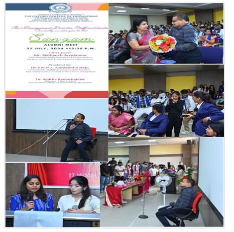 The Department of MBA of The Oxford College of Engineering Organised SANGAM – Alumni Meet on 27th July 2024, an event to remember, as alumni from various batches gathered to reconnect, reminisce, and celebrate the legacy of the institution. Held at 6th Floor Seminar Hall on 27th July 2024 from 12.30pm onwards. The Chief Guest for the Event: Mr. Siddharth Jayakumar, Banker, Author, TEDx Speaker. The chief guest shared his life experiences and audience gave a standing ovation as he has crossed many hurldes with Cerebral Palsy and achieved many awards for his achievements. The event kicked off with a warm welcome by the alumni association, followed by an inspiring speech from Dr. H.N Ramesh, Principal, The Oxford College of Engineering, who emphasized the importance of the alumni network in supporting the growth and development of the institution. Alumni shared their journeys with the audience, recounting how the values and skills learned during their time at the institution had helped them excel in their respective fields.